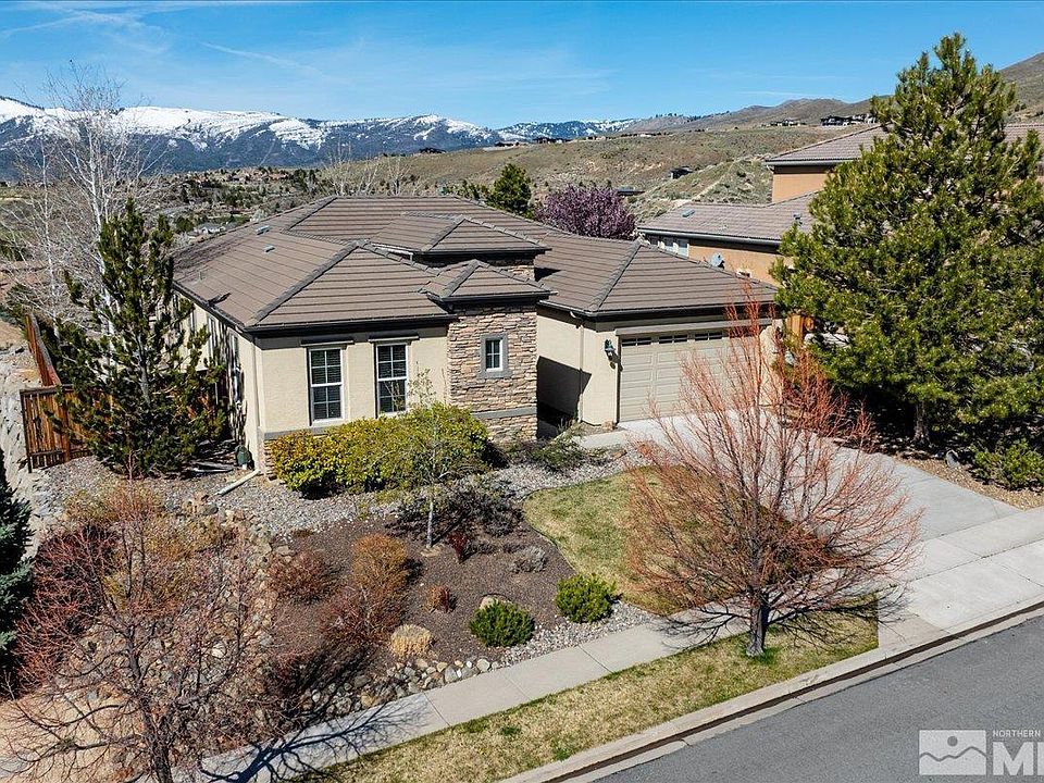 Nestled in the heart of Northwest beauty, this premium lot single-story residence is a sanctuary of unparalleled scenery and comfort. Spectacular views of the mountains and Peavine Valley from every angle, with upgrades and attention to detail that elevate this home above the rest. One of Reno's very best view lots and the most premium lot in the neighborhood! Enjoy sunsets over the California and Nevada mountains every day and moonsets over the same mountains every night., Step inside to discover a gourmet kitchen that is a chef's dream. An oversized, commercial-grade stainless steel island, adorned with reclaimed plank wood, complemented by a gorgeous backsplash for an added elegant touch. The kitchen features a 6-burner Viking cooktop, ideal for culinary adventures and large groups, and an oversized sink that combines functionality with style. Throughout the home, you'll find wonderful slate floors that exude both charm and durability, while custom paint accents the walls with style and taste. Multiple large sliders, including from master retreat, beckon you to step outside and immerse yourself in the natural splendor of the surroundings, inviting the outdoors in and creating a seamless connection with nature. The master bath is a sanctuary of relaxation, boasting elegant stone work, radiant heated floors, a large walk-in closet, and a fabulous steam shower. Hardwood floors grace each bedroom, infusing warmth and character into every corner of the home. Situated in the highly desirable area of Canyon Pines, just off of Somersett Parkway, this home offers a peaceful and tranquil lifestyle. Whether you're entertaining guests in the spacious great room, unwinding in the comfort of your master suite, or laying outside on the hammock, you'll be surrounded by awe-inspiring views that serve as a constant reminder of North Nevada's beauty. At twilight, enjoy the most stunning and immersive sunsets you've ever witnessed, followed by the most majestic and unpolluted starry skies at night. It is quite the spectacle. This home features four bedrooms, two bathrooms, and a spacious three-car tandem garage equipped with a Tesla Wall Connector and ample storage. It also boasts an extended driveway and mature trees that enhance privacy and add charm, offering a blend of convenience, space, and tranquility. Owners have the option to join the Somersett Golf course promising endless opportunities for entertainment, recreation, and relaxation. Don't miss out on the opportunity to make this extraordinary home your own. With its unrivaled views, thoughtful upgrades, and enviable location, this home offers a lifestyle that is nothing short of exceptional.