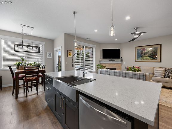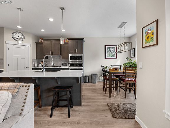 New price!! Now $640,000O!! Save money-Seller may participate in interest rate buy down for full price offer. Compare with new construction, your dollar goes far here! The interior greats you with 10' high ceilings, roomy great room open to large quartz island in kitchen and dining area. Quartz counters, island and eating bar, large pantry, 5 burner gas cooktop, coffee station and stainless appliances, refrigerator included. Laminate floors throughout, with all bedrooms carpeted. Ceiling fans in all bedrooms and living room. The primary suite is sure to please, with tray ceiling, beautiful bathroom suite with tile floor, floor-to-ceiling tile shower, large soak tub and quartz counters with dual sinks. Large walk-in closet. Primary and dining area, both have doors to covered patio. Spacious one level home with paved and gated RV parking. Room for 35' 5th wheel with all slides open! 50 amp hookup and sewer dump! Included is extensive landscaping, blinds, fence, 10 x 12 Tuff shed and 1 smaller Rubbermaid lean-too shed and more. Custom built timber patio cover, by Ricks Fencing. Garage with epoxy floors and 4 custom overhead storage racks and shelves. Large 10 x 12 Tough Shed in back of RV pad, prewired for hottub on that side behind shed. New exterior premium paint in fall of 2024. Extra electrical added in garage with dedicated outlet for crafting and hobbies and generator hookup. Ring doorbell with 3 floodlight cameras included. Low maintenance & level backyard. Lots of room for gardening and beautiful landscape with lots of hydrangeas, peonys, lilacs, crepe myrtle, stargazer lilies and more. 1 block to the paved hiking trail which is 3 miles to the Willamette River. Local Timber Park park and Baker Prairie school and field less than a block away. Great for your furry friends and family to play.