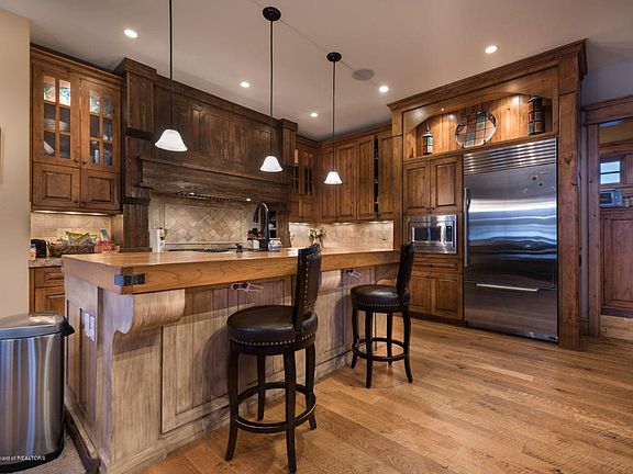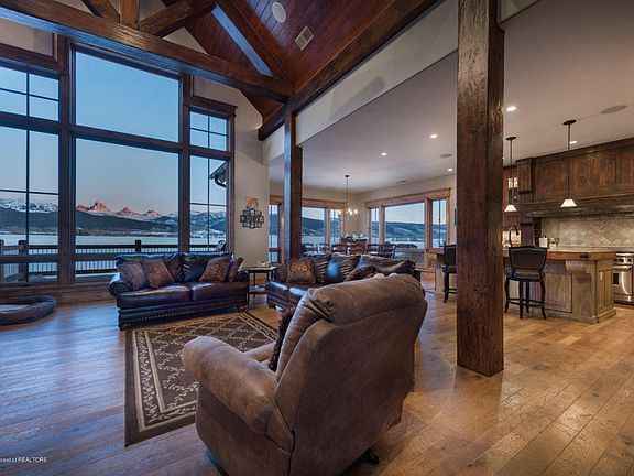 Striking Teton views along Stateline Road between Idaho and Wyoming, this 4 bed, 5 bath ultra-custom home overlooks a large pond and the sprawling foothills of the Teton range. Guests are welcomed by a dramatic vaulted great room with a mix of timbers and finely crafted wood finishes. A wood burning stone fireplace provides warmth and ambience throughout the sizable kitchen and dining area. A large den separates the living area from the substantial main floor master. Each room throughout the home is complemented by it's own private bath. The daylight basement boasts a second living room, kitchenette, separate laundry, and theater room. The custom finishes and spectacular views are coupled with extensive landscaping on the finest building site this development and Teton Valley has to offer.