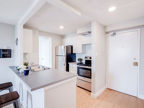 Our remodeled bachelor, one, two, and three bedroom suites feature charming kitchens complete with stainless steel appliances and a versatile breakfast bar. These pet friendly suites pander to both comfort and convenience with gleaming laminate flooring throughout, large windows, and private balconies with beautiful city views. Residents also enjoy modern laundry facilities, ample parking, and a fully equipped fitness facility.