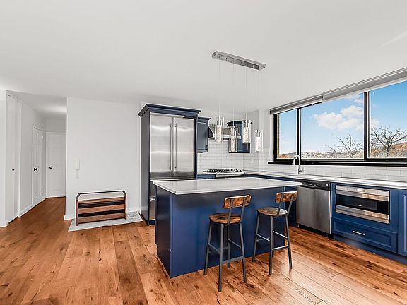 Discover luxury living at Riverpointe in this beautifully appointed 2-bedroom, 2-bath condominium, complete with deeded parking and a private terrace showcasing serene river views. The Palisades Cliffs, Inwood Hill Park, and surrounding natural landscape create an impressive backdrop. The sun-filled living room and kitchen are framed by expansive picture windows that capture the southern light and provide seamless access to the terrace. The open-concept kitchen features a contemporary island with seating, blue shaker-style cabinetry, white quartz countertops, a classic subway tile backsplash, and stainless steel appliances. The primary suite offers a generous walk-in closet with custom built-ins and a modern en-suite bathroom. Riverpointe residents enjoy a full suite of amenities, including a 24-hour doorman, fitness center, roof deck, central heating and cooling, and pet-friendly policies. Ideally located just moments from shops, restaurants, and the Spuyten Duyvil Metro-North station, with a quick 25-minute ride to Grand Central. Several photos have been virtually staged to help illustrate the home's potential.