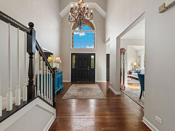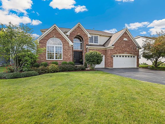 Get ready to be impressed by the luxury and elegance of this two-story, brick-front home with a heated three-car garage. The grand foyer welcomes you in with a dual staircase and gorgeous dark hardwood that was recently refinished. This home features gorgeous plantation shutters and plantation door for an additional touch of elegance. Cozy sitting room and dining room lead to the recently remodeled kitchen with quartz counters, SS appliances, custom cabinets, island seating, and a walk-in pantry. Enjoy the two-story family room with a fireplace and built-in entertainment center. The first floor den is the perfect office retreat. Updated first-floor powder room too! Upstairs is a master suite with a walk-in closet and spa-like bath with updated cabinets and quartz counters, as well as three other bedrooms and another full bathroom and an updated laundry room. Newer premium carpet and pad upstairs. Entire home was repainted in 2019, roof replaced in 2016 and new AC in 2021. Beautiful outdoor oasis in the back with a fenced yard, stamped concrete patio and lush landscaping. Convenient location just minutes from 88, shopping and dining. Welcome Home!