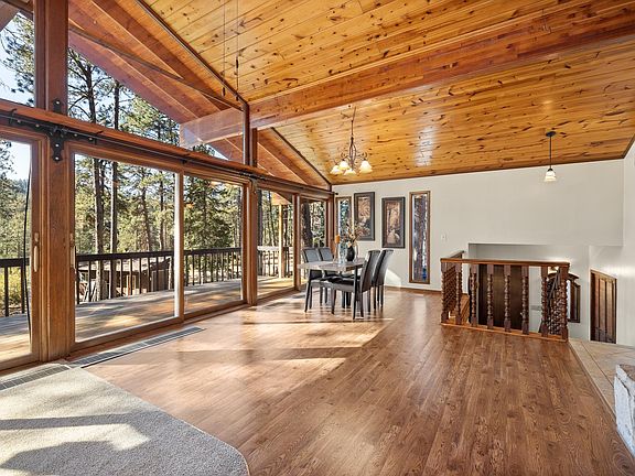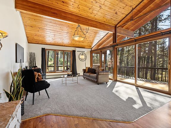 Nestled on 1.11 acres bordering the Black Hills National Forest, this remarkable contemporary lodge-style retreat blends privacy, comfort, and beauty in perfect harmony. Surrounded by towering pines and scattered granite boulders, the home feels worlds away yet lies only 15 minutes from Rapid City and within walking distance of Rimrock Church, the community center, and a local tavern in charming Johnson Siding. Step inside to soaring vaulted wood ceilings, exposed beams, and massive windows framing forest views in every direction. Warm natural finishes, stone fireplaces, and handcrafted details, give this home a distinctive character rarely found today. With 4 bedrooms (1 ntc) and 2 separate living spaces across 2,600 square feet, the layout offers both open gathering areas and private retreats. The main-level great room flows onto an expansive freshly refinished deck, ideal for entertaining or quiet evenings listening to the wind in the pines. A lower-level family room provides additional living space and opens to the surrounding landscape. The expansive kitchen with breakfast bar anchors the main living space, offering an inviting spot for breakfasts or gathering with friends after a day in the hills. Whether envisioned as a full-time mountain residence, vacation getaway, or creative retreat, this property offers a rare combination of tranquility, accessibility, and timeless design. Listed with Abbey Hutson, NavX Realty, 952-334-7290.