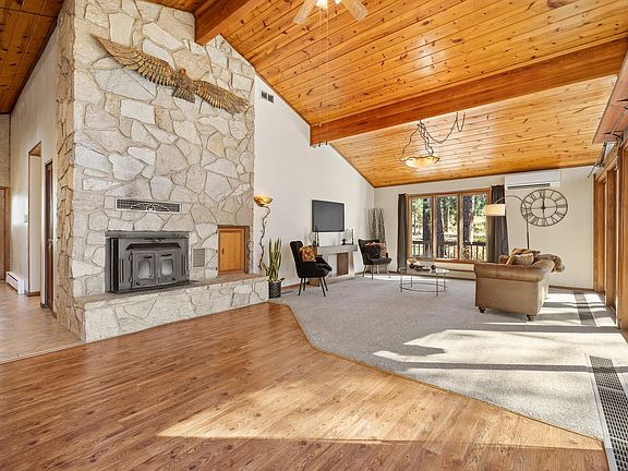 Stone fireplacesSoaring vaulted wood ceilingsExposed beamsScattered granite bouldersSurrounded by towering pinesHandcrafted detailsLower-level family room