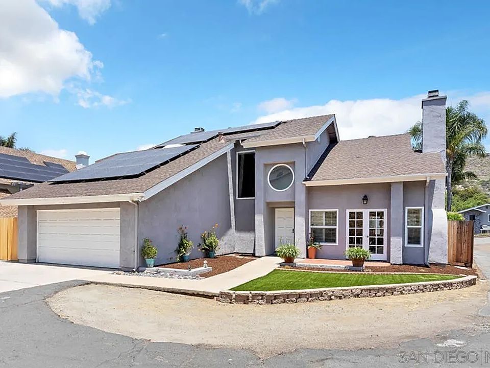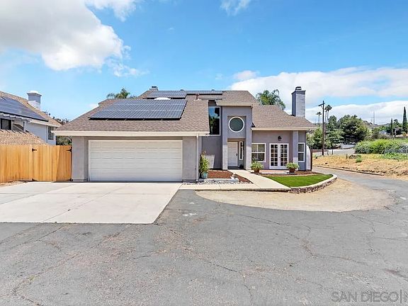 Welcome to your dream home in the highly sought-after Granite Hills area of El Cajon! This stunning 3-bedroom, 2.5-bathroom home with solar offers the perfect blend of privacy, luxury, and views. On the main floor, the formal entryway features soaring ceilings that set the tone for the rest of this beautiful home. The living room has vaulted ceilings, a custom fireplace, and elegant French doors that lead out to a front patio. The adjacent dining room provides a seamless flow, perfect for entertaining. Attached to the chef's kitchen is a family room with an additional fireplace and a wet bar. The sliding door opens to a resort-like backyard with pool, spa, built-in BBQ, wooden deck, and two structures that can be used as pool cabanas, craft rooms, man-caves, etc. The primary suite features an ensuite bathroom and a bonus sitting area that overlooks the backyard and pool. All three bedrooms boast beautiful sweeping views.