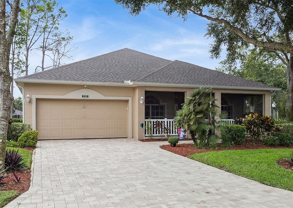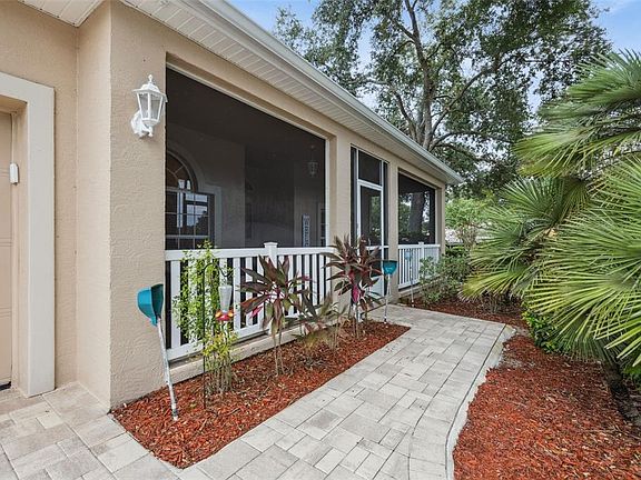 The home you have been waiting for in Kings Ridge the 55+ resort community of choice in Lake County. 3/2 plus 2 flex spaces plus a formal dining room. One is off the rear of home adjacent to covered and screened lanai and one is at front that can be a home office, den or formal living room. 2154 sq ft with plenty of room to spread out. Split bedrooms, high ceilings, open floor plan, too. No need to use an extra bedroom for a home office, exercise space or craft room. Fabulous large eat in kitchen with room to add an island, new lux vinyl plank flooring throughout (2025), new interior paint (2025), new appliances 2025, Roof 2021, AC 2021, Water Heater 2021. 2 screened in outdoor areas, front porch and rear lanai. New Paver Driveway and sidewalk 2024. Great location scenic, lush and quiet location on golf course at Hole #7 and at end of street on cul de sac, too. Kings Ridge is a 24 hour guard gated community with 2 golf courses, 3 swimming pools, tennis, clubhouse, activities, classes, excursions, etc. Easy access to great shopping, dining, medical facilities, Publix, nails without entering a main road. Golf carts welcome here. Monthy maintenance includes exterior repainting, cale and lawn care. NO REAR OR RIGHT SIDE HOME NEIGHBORS.