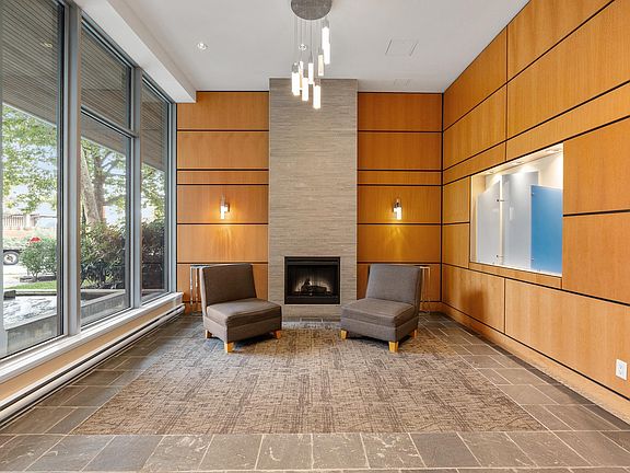 Built in 2008 by renowned Polygon, Watercolours is a sturdy concrete tower on a peaceful, private street, offering stunning, unobstructed city and mountain views. This bright 2-bed, 2-bath corner unit features an open layout with floor-to-ceiling windows, flooding the space with light. Recent upgrades include new flooring, fresh paint, a modern fridge, and a sleek cooking range. The stylish kitchen boasts granite countertops and chic cabinetry, paired with an electric fireplace and a spacious balcony ideal for relaxing or entertaining. Amenities include a top-notch gym, bike storage, lounge, indoor hot tub, steam room, and sauna. Perfectly located, it's a short walk to Brentwood Town Centre, Skytrain, BCIT, and a vibrant mix of restaurants and shops, blending urban convenience with serene.