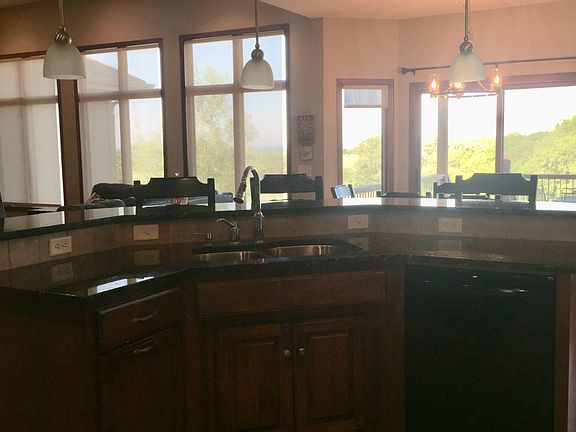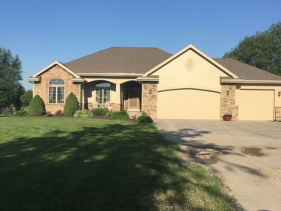 Enjoy the sunsets in this Custom built ranch home on 5 acres. Built in 2006 with basement completion in 2012. This lovely home offers open concepts, hearth area, pocket office, laundry with storage, 5 bedrooms, 3 1/2 baths, exercise room, 3 car garage and tons of storage. Main floor square footage 2,092. The main floor has beautiful hickory hardwood floors and carpet in open concept main area. Large windows allow enjoyment of beautiful view and private living . Hearth area features a propane burning fireplace and the connecting Pocket office has cabinets and file drawers. Laundry room has a utility sink, cabinets and locker area. Kitchen features center island, granite countertops, birch cabinets, pantry and appliances. Drop zone and 1/2 bath off kitchen area. Enjoy the quiet on the large partially covered deck. There are 3 upstairs bedrooms. En-suite Master has double vanity , tile floor, Jacuzzi tub and walk-in closet. Two nice sized bedrooms with raised ceilings and a main floor bathroom complete the main level. Finished basement square footage 1,350. This is entertainment central with beautiful bar area and lots of room for games. There are 2 more bedrooms, bath, flex room and large storage area. Never run out of hot water with 2 Propane water heaters! Furnace and heat Pump are electric. Patio area is perfect place for a barbecue. Large yard area with automatic sprinklers for family activities.