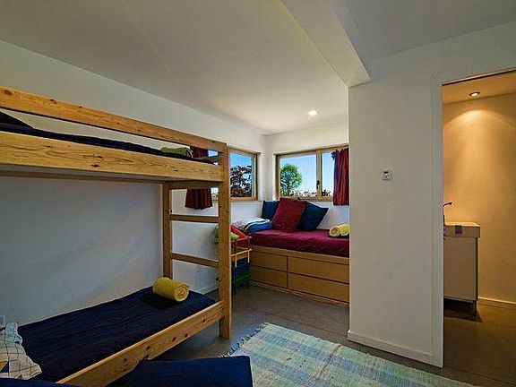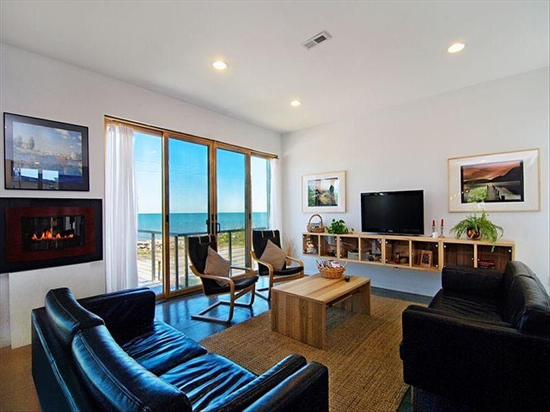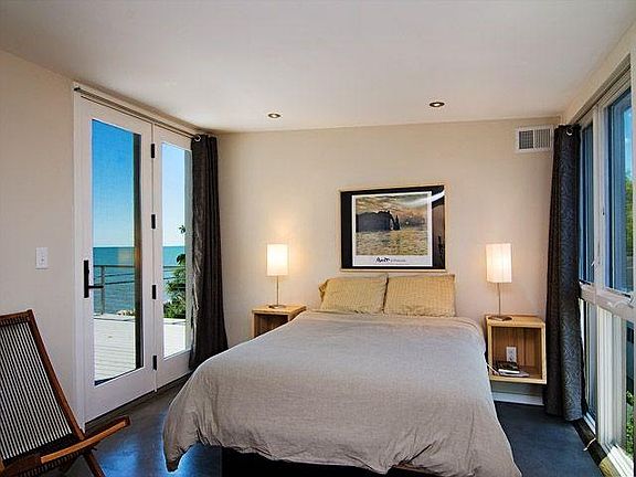 Located on the peninsula just a few miles down the road from Cedar Point Amusement Park. This unique modern home was built to maximize the dramatic views of Lake Erie and Sandusky Bay from nearly every room in the house. The key design element of this home was the use of large expanses of glass and windows to frame the stunning waterfront views while allowing abundant natural daylight to illuminate the modern open floor plan. The main living level has an amazing twenty-four foot wide expanse of glass doors that open from the great room to a deck overlooking the lake. The great room has a large flat screen TV and fireplace, while the deck is complete with a BBQ for your summer meals. The large kitchen was carefully designed and built to have the same great views while being open enough for entertaining or preparing gourmet meals. The kitchen features concrete counters with two food preparation areas, stainless appliances, Kraftmaid cabinets, and maple flooring. The top level of the home, which also frames beautiful water views, has two bedrooms and two baths and a large sun-drenched deck that overlooks the lake and the bay. Bedroom 1 has a queen bed, has a TV, with private bath including a slate shower and access to the deck. Bedroom 2 has 12 feet of sliding glass doors overlooking Lake Erie, a double bed, and bath with slate shower, and access to the deck. The 3rd Bedroom, with a set of bunk beds a single bed, has a TV and its own private bath with shower. A deck at the end of the lane provides a nice place to enjoy fishing and sunsets over the bay. If you are planning a visit to Sandusky in the near future please consider staying in this modern vacation property, which was designed and built by a local Sandusky family. This brand new home was finished in May 2009, and is now available to rent. Thanks for visiting our site