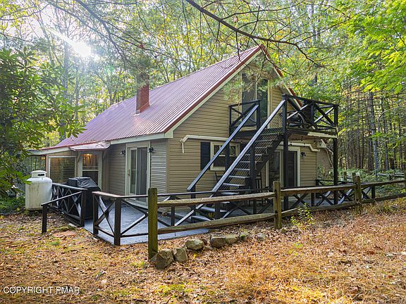 Welcome to your private woodland escape! This beautifully updated 4-bedroom, 2-bath chalet-style home sits on 2.95 mostly wooded acres, offering peace, privacy, and plenty of space to roam. The property features two serene ponds, a paved circular driveway, and a two-car attached garage with a convenient overhang. Inside, enjoy a completely refreshed interior with new flooring throughout, all new windows, stylish light fixtures, and a fully remodeled bathroom. The kitchen has been thoughtfully updated with modern touches, and comfort is key with two mini-split units in the bedrooms, a propane fireplace and stove, plus a brand new propane furnace to be installed before closing. Outbuildings galore! You'll find four large sheds for storage or hobbies, plus a detached large car port perfect for workshop space or outdoor toys. The home also boasts a newer metal roof and a new well and pump installed just 4 years ago. This property has it all—privacy, charm, and room to grow. Don't miss your chance to own this one-of-a-kind retreat!