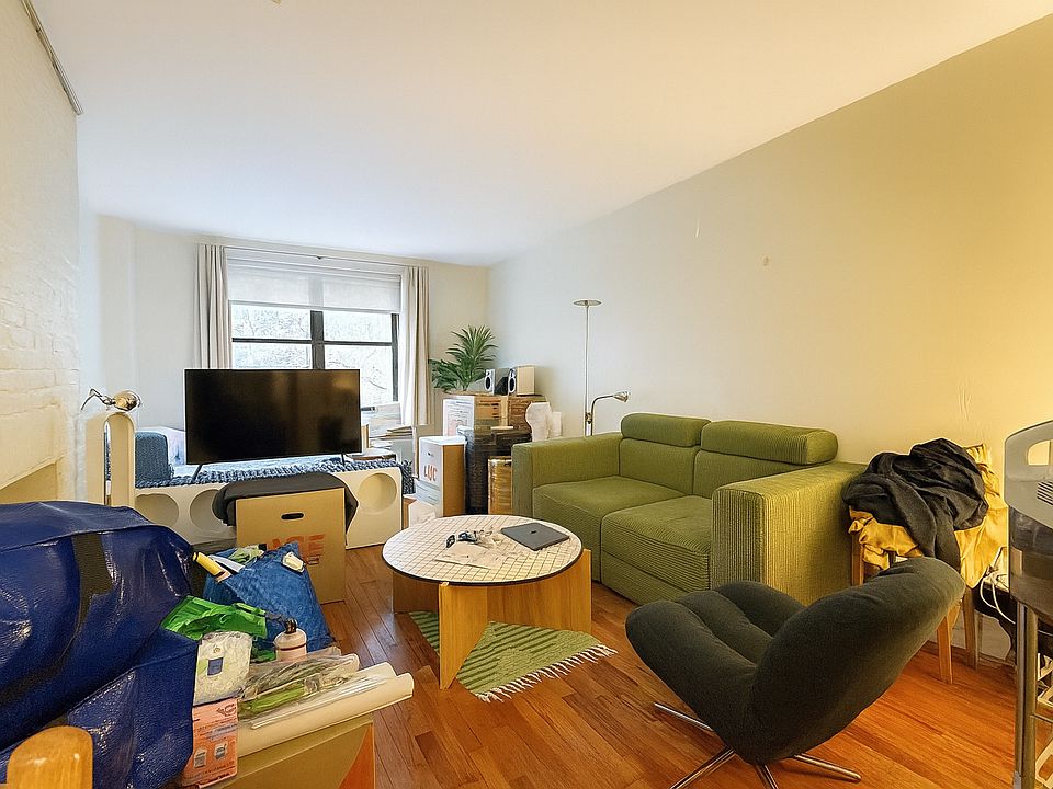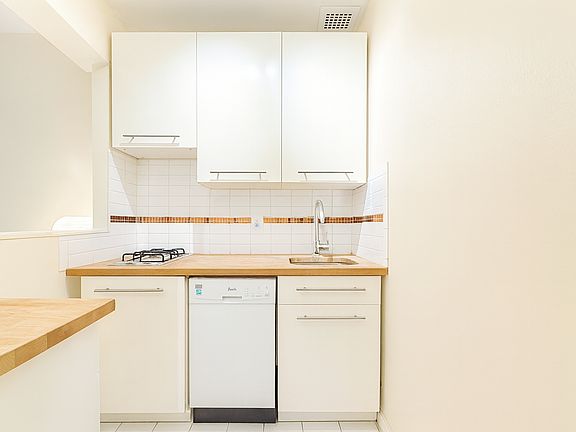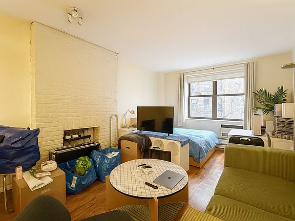Decorative fireplaceFull-sized refrigeratorThru-wall air conditionerLaundry roomButcher block countertopsSouthern exposureSpacious and light-filled studio