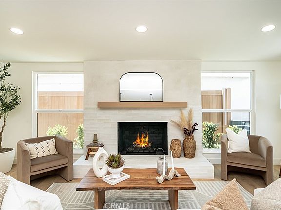 Get ready to fall in love! This exquisitely transformed home in Eastside Costa Mesa is warm, bright, welcoming, and full of luxurious upgrades. The generous front porch adds ample outdoor living space. The front door opens into the main living space, which features high ceilings and large, new windows that flood the room with light. The beautiful fireplace in the living room beckons you to enjoy cozy nights in. The elegant kitchen has been thoughtfully updated with Custom White Oak Cabinets, a massive porcelain stone island from Bedrosians, MSI LumaLuxe quartz everywhere else, Signature Brand appliances, including a paneled fridge and dishwasher. The warm tones of the engineered hardwood flooring flow from room to room and the beautiful West Elm decorative lighting throughout the interior elevate each room. The alluring primary suite is cozy, yet spacious with a gorgeous en suite you just have to see! The passthrough window to the kitchen is perfect for serving guests while entertaining out back as the living space extends onto the enormous patio and includes a wall-mounted TV under the beautiful, Alumiwood patio cover. And the newly epoxied garage is spacious enough for two cars, tons of storage, and the laundry area. The list of recent upgrades also includes: new roof, windows, HVAC, custom garage door, washer and dryer with cabinets, Alumiwood fence around front yard, and more.