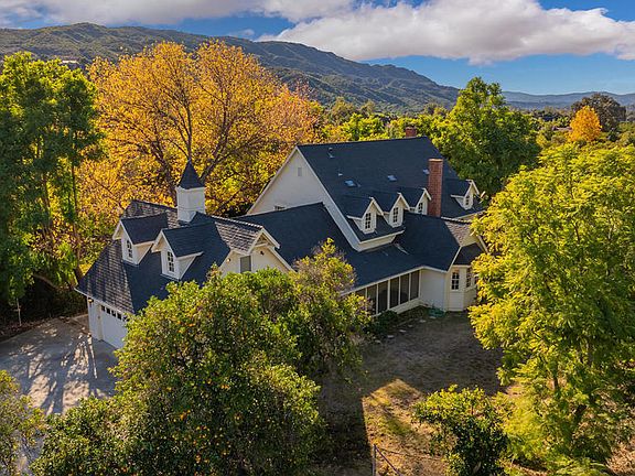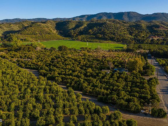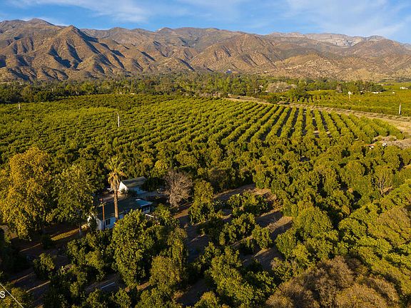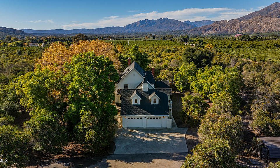 First time on the market- A beautiful farmhouse with captivating views on 43 acres. Set back from the road and hidden amongst an orange grove sits the main residence, an elegant farmhouse. The grandeur begins with the majestic entry leading to the great room with beamed ceilings and bar area, walls of windows and a brick fireplace flanked by built ins. The 3-bedroom, 3-bathroom home is a perfect blend of classic charm and modern amenities. Spread over 3,350 sq.ft. the well-appointed guest rooms offer a warm and inviting retreat for your guests. Oak flooring and coffered ceilings create a warm, inviting atmosphere. The spacious rustic brick kitchen is both functional and aesthetically pleasing which adjoins the formal dining room with vaulted wood beamed ceilings and a brick fireplace leading to the crafted dark-wood paneled study which could be used as a fourth bedroom. The spacious primary suite offers comfort and tranquility showcasing impressive, exposed wood beams. This eco-conscious estate is equipped with solar panels, reducing energy costs and environmental impact including a backup generator system. The property includes two APN's, two private water wells (currently only one functioning well) and a 3-inch ag meter from casitas water.