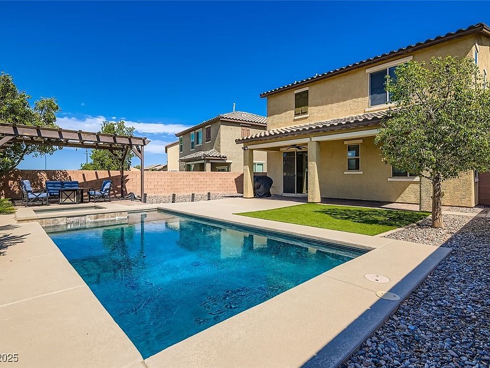 RARE FIND! Gorgeous home with POOL in one of the few newer (2015) communities adjacent to the desirable Green Valley area, with access to multiple parks, trails, shopping, and dining. The spacious floor plan offers 3 bedrooms and a huge loft upstairs plus a versatile room downstairs, ideal as a home office, or guest bedroom. All living areas and the primary suite showcase elegant laminate flooring, with tile in the kitchen and baths; staircase & bedrooms 2+3 feature cozy carpet. The kitchen boasts 42" raised cabinets, granite counters, stainless steel appliances, pantry, reverse osmosis and recessed lighting. Ceiling fans and blinds throughout enhance every room. Both bathrooms upstairs feature dual sinks. The primary suite offers a walk-in closet with custom shelving. Brand new water softener! Outdoors, enjoy the large covered patio, sparkling POOL & SPA, low-maintenance desert landscaping with artificial turf, and a gazebo—perfect for entertaining and relaxation. Enjoy the 3D Tour