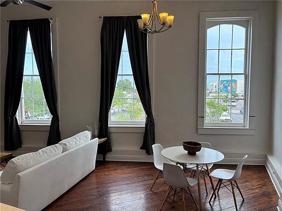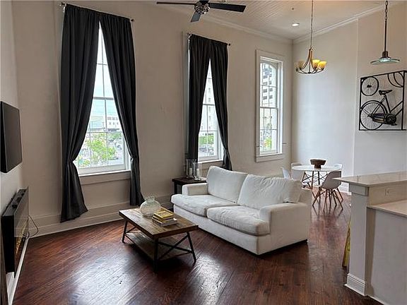 Roomy and light-filled apartment. Large open-concept living area and big bedroom. Washer and dryer inside unit. Pets considered with a $250 non-refundable one-time-only pet fee. Can be leased furnished for an additional $200 monthly. Easy 2nd-floor walkup in the heart of the action of the French Quarter and two blocks from Central Business District and Ceasar's Casino.