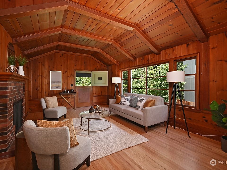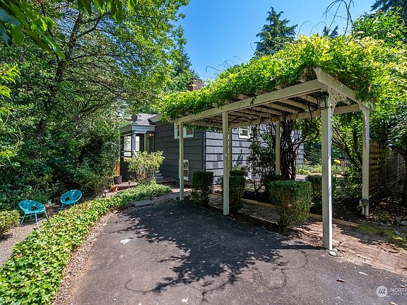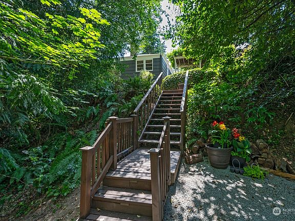 Prepare to be delighted by this one of a kind bungalow. Dutch door opens to a spectacularly charming living room with original vaulted ceilings and brick fireplace. Newly refinished oak hardwood floors. Sweet open staircase to upstairs bedrooms overlooks living area. Separate dining room with built-in cabinet and glass door to deck. Light filled kitchen with stainless steel appliances opens to backyard grilling area & private outdoors. Finished lower level includes media room, primary bedroom & bath suite with an extra large walk-in closet. Workshop/storage & laundry rooms. New exterior & interior paint. Plenty of off-street parking! Wonderful neighborhood adjacent to Lakeside School/field. Stroll to park. Easy access to Light Rail & I5.
