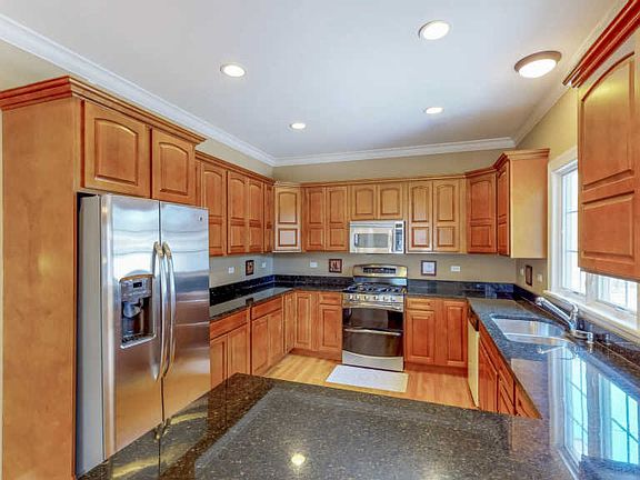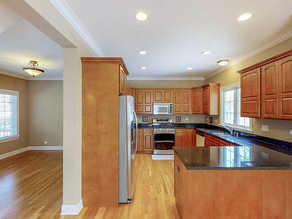 Check out the photos and video tour of this lovely 4 bedroom, 3 bath home, or better yet, make an appointment to see it today. This home welcomes you with 9 ft ceilings, crown moldings, tray ceilings, and all hardwood floors on the first floor; Kitchen boasts gorgeous granite counters with counter seating, lots of maple cabinets, and stainless steel appliances; spacious Family Room has a gas-log fireplace and large doors that lead to paver patio and yard; Office on 1st floor; Master Bedroom with ensuite and walk in closets; 2nd floor laundry. Conveniently located to schools, parks, shopping, dining, Metra, and Interstates.