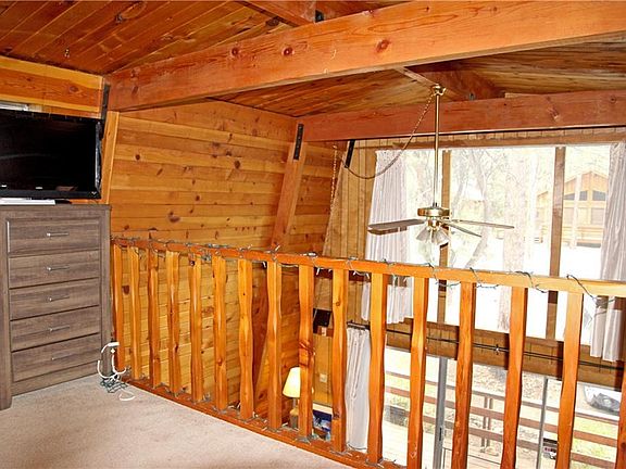 This cozy full roof gambrel is just waiting for someone to make it their own. Backing to Meadowbrook, enjoy peaceful gatherings on the back deck. The classic open beam interior with tongue and groove finish and rustic fireplace has that mountain getaway feel, with vaulted ceilings and open loft area which is considered the second bedroom. An extra half bath has been added upstairs for convenience. A separate laundry room off the rear deck offers extra storage along with a large sturdy storage shed. The roof was sheared, insulated and re shingled in 2002 with permit.