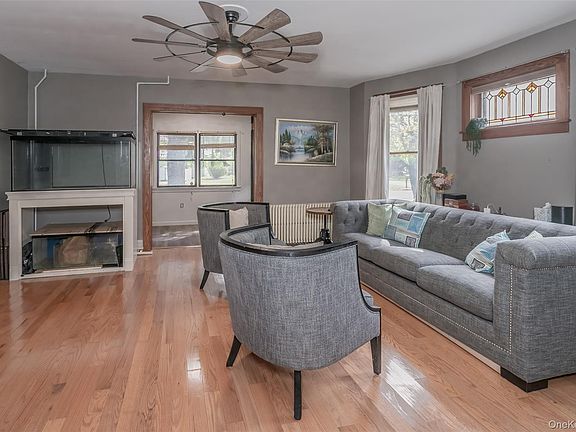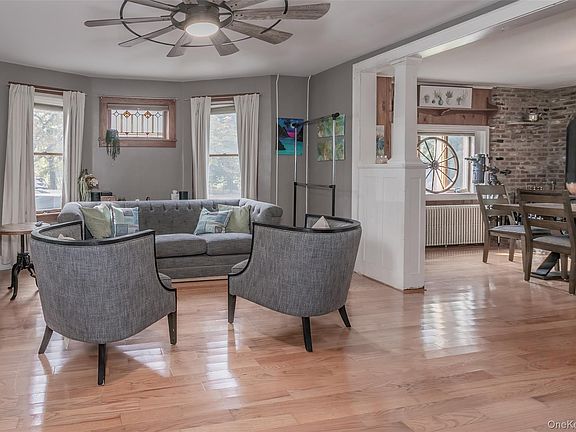 Nestled among the famous Black Dirt Region farms of Pine Island on over an acre of useable property is this cape/colonial home with a welcoming front porch. Walk into the large family room with stained glass and attached sun/sitting room through a set of french doors. Through the archway with original details (woodwork and leaded display doors) is the formal dining room with cozy wood burning stove. First floor full bathroom and office give more space and flexibility. Kitchen offers island, 5 burner stove, stainless steel appliances, and plenty of storage. Upstairs you will find 4 bedrooms, one double sized, and a well appointed bathroom. Walk up full height attic offers lots of storage space and future possibilities. Basement has high ceilings and a walkout. Level yard has space for activity or lounging around the firepit. The detached 2+car garage offers even more storage and a workshop.