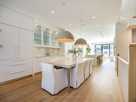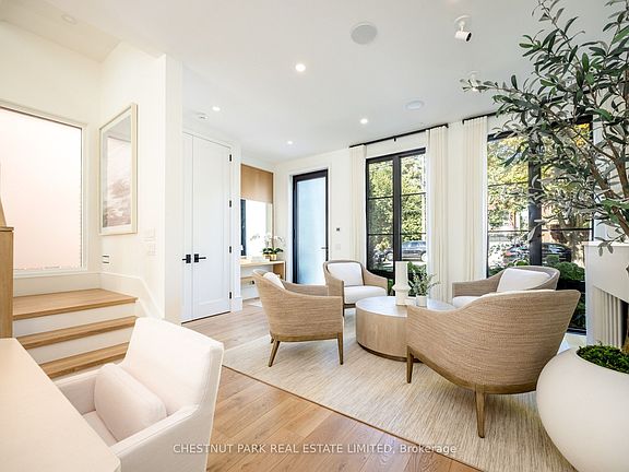 This contemporary custom-built detached residence showcases exceptional craftsmanship & meticulous space planning. Featuring a coveted southern exposure, it blends symmetry with serene, modern comfort across four finished levels, offering 4+1 bedrooms & 5 baths (3,637 sf total; 2,520 sf above grade). The private drive, porch & side path incl snow-melt for effortless year-round convenience.The main floor features 10' ceilings, light European oak wide-plank flooring, solid-core doors & layered architectural lighting. A formal living room w/fluted wood paneled gas fireplace opens to a spacious dining area w/integrated storage ideal for family living & entertaining. The kitchen showcases custom millwork, quartzite slab counters & backsplash, integrated paneled appliances, dual pantries & a quartzite waterfall island w/ seating for four. A sun-filled family room connects seamlessly to the landscaped urban garden through 9' sliding glass doors. The outdoor space incl a patio w/lush plantings & a brick garden structure mirroring the home's architecture. A striking powder room & side-entry mudroom complete this level. Upstairs, the primary suite offers city & treetop views, a marble-clad ensuite w/freestanding tub, double vanity, make-up table, heated floors & walk-in closet. A 2nd bedroom w/ensuite & a full laundry room complete the floor. The 3rd level features two bedrooms, a shared bath & walk-out to a 266sf private terrace w/expansive views. The lower level has radiant-heated floors throughout, a recreation/media room w/custom wet bar, guest/nanny/exercise room w/3-pc bath, rough-in for second laundry or mudroom & ample storage. Additional highlights: high-efficiency mechanicals, in-ground irrigation, landscape lighting, integrated audio & extensive custom millwork. Set on the sunny south side of Sheldrake in Sherwood Park steps to Summerhill Market, Mt. Pleasant & Yonge, parks, restaurants & top schools- zoned for Blythwood/NT & near Toronto's leading private schools.