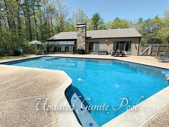Sprawling CALIFORNIA Style RANCH with 3 STALL BARN. This property was once Featured in The Union Leader. Private and peaceful setting next to 150+/- acres of conservation land with trails across the street. Bright & Airy GREAT ROOM with HARDWOOD Floor, Wet Bar and NEW Solarium. The adjacent kitchen offers GRANITE Counters and Breakfast Bar. Primary Bedroom with SITTING area and Direct ACCESS to the POOL (4'+/- shallow end - 8'+/- deep end). En Suite with New Vanity, Large JETTED TUB. This HORSE property READY has a large barn with 3 stalls and tack room. Electric and water (water has not been turned on in many years) Open area in the back and side for a paddock. Unique Center Courtyard – A little retreat right in the center of the home. Conservation land with DIRECT ACESS in the back to the Exeter River, great for kayaking. Host a pool party or dine by outdoor candlelight in the center courtyard - whatever you do this beautiful home lets you enjoy the outdoors day or night. Large 2.5 Car Garage – Room for the cars and all the other stuff! Come and embrace the casual flair of the California lifestyle. Located in beautiful Chester, NH just 50 minutes from Boston, ENJOY a country setting and cultural benefits of a nearby metropolitan area. UPDATES: 2023: Many Rooms Painted, 2021: 2 Chimney Liners & Caps, 2020: Roof, Vinyl Siding, Gutters, 2019 Kitchen Appliances, 2018: Renewed Gunite pool & pump. Other Updates: Hardwood floors, Solarium replaced, Bathrooms.