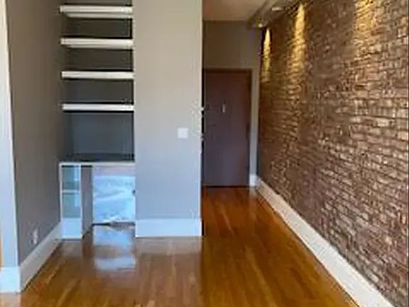 This expansive 818 sq. ft. one-bedroom home features high ceilings, exposed brick walls, and abundant natural light through its south-facing windows. A generous windowed kitchen features custom cabinetry, granite countertops, and a premium GE Profile stainless steel appliance suite: bottom-freezer refrigerator, five-burner range, dishwasher, and built-in microwave.