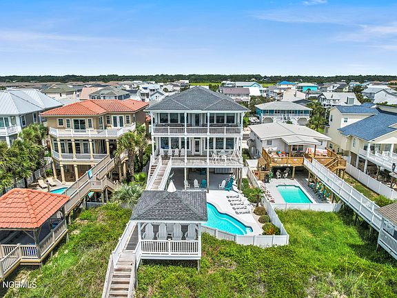 This captivating home offers jaw-dropping, unobstructed views of the ocean and seaside décor that mixes beautifully with its modern rustic style featuring custom made furniture with reclaimed wood. Catering to large families, the house sleeps a total of 20. There are five king bedrooms, with two of those having two king beds. The adorable children's room has six bunkbeds that also includes a play area and a bathroom with two showers. The primary suite has a sloped ceiling and highlights magnificent ocean views. The bath boasts two separate vanities and a shower that has dual controls with rain shower and adjustable hand-held shower head. English oak wide plank flooring flows throughout the main level under a 10' ceiling and opens to a large covered deck with a walkway to the gazebo and beach. The kitchen is outfitted with custom cabinets, leathered granite countertops, composite granite sink, an island prep sink, Bosch induction 5-burner cooktop, and convection built-in oven/microwave. Two exquisite chandeliers hover over the custom made dining table that seats 12 and there is also extra seating at the counter. A second living area on the top floor enjoys the same wide plank flooring, ceiling beams, two custom barn doors and a cathedral ceiling spanning 9'-14' high. This room opens to another spacious deck. Here you can relax on the newly (2023) purchased deck furniture and look up to see the cathedral ceiling with exposed rafters while taking in the unmatched view of the Atlantic. There are two laundry rooms, one on each floor for your convenience as well as 3 large locked owner's closets and abundant locked storage space. The spacious ground level leads to the 32' saltwater pool with plenty of room for sunbathing and an outdoor shower. Additional features of this home include a 3-stop elevator, Gold Fortified Home designation, hurricane rated doors and windows, geo-thermal HVAC (no outside units to replace approximately every 4 years), two 80 gallon water heaters