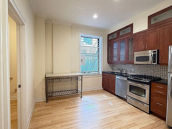 This generously sized apartment features exotic imported African hardwood floors, solid leaded glass doors, soaring 10-foot ceilings, recessed lighting, and elegant crown moldings throughout. A charming decorative fireplace adds warmth and character, while the in-unit washer/dryer provides everyday convenience.