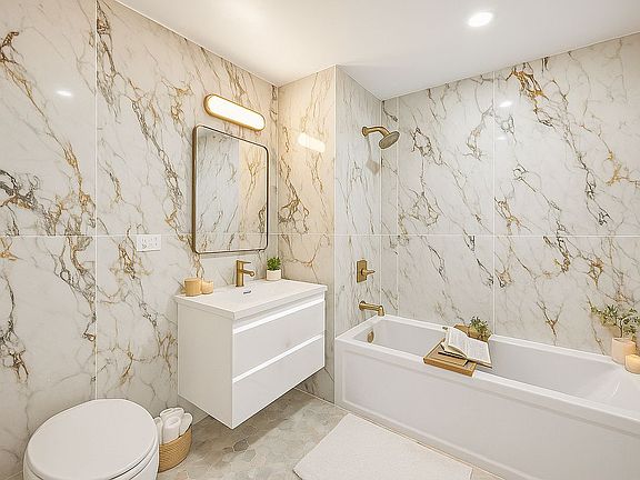 The bedroom can accommodate a king-size bed and boasts a large reach-in closet. The bathroom has stylish ceramic tilework, modern fixtures, a Toto toilet, and a deep Kohler soaking tub. Finishing the home are a convenient in-unit Bosch washer and dryer, an additional reach-in closet, and Spectrum internet pre-wiring.