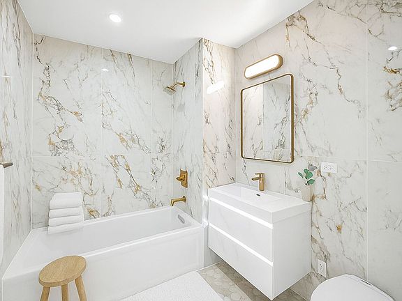 The bedroom boasts an oversized reach-in closet, and the bathroom has stylish ceramic tilework, modern fixtures, a Toto toilet, and a deep Kohler soaking tub. Finishing the home are a convenient in-unit Bosch washer and dryer, an additional reach-in closet, and Spectrum internet pre-wiring.