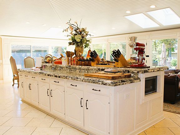 Dramatic stone fireplaceIn-ground poolPlay areaElegant architectural detailsPrivate resort-style oasisLarge center islandCrown molding