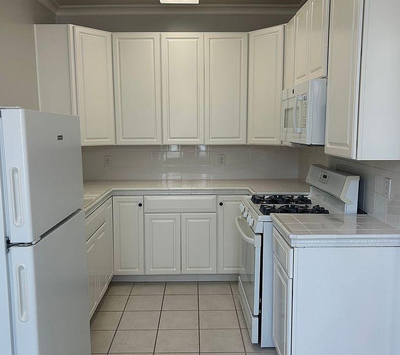 - White appliances: Self-cleaning gas range, refrigerator, dishwasher, built-in microwave