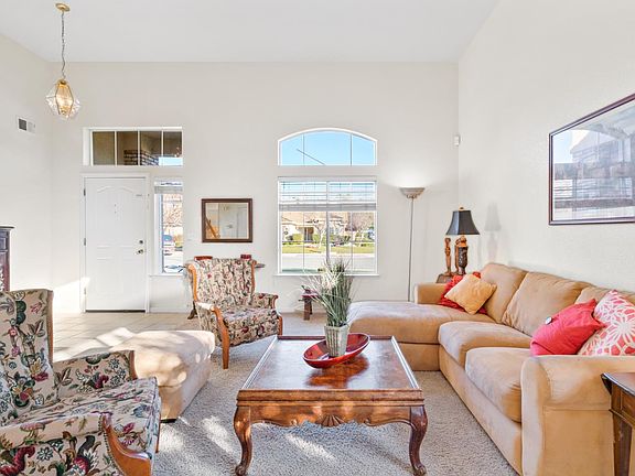 A terrific home in a lovely neighborhood setting: Soaring ceilings welcome throughout this spacious home w/4 Bedroom (1 bd on main floor ) Master w/ ensuite w/ rm.sized retreat space within, 2 full baths with tile counters & floors Upstairs bedrooms w/ walk-in closets baths w/ double sinks, tubs & showers, 3 car garage. Natural lIght floods kitchen w/ gas stove, tile counter tops, hard surface floors, brkfst. bar, kitchen eating area, open and easy access to adjoining family room w/ desk area & fireplace. Living room has 2 story ceilings w/dining areas that helps showcase the charming staircase. Backyard & patio make additional living and entertaining areas a special treat. Forced air heating. Lots of storage. Built-in appliances remain in home. A total treat! Come visit it!!!