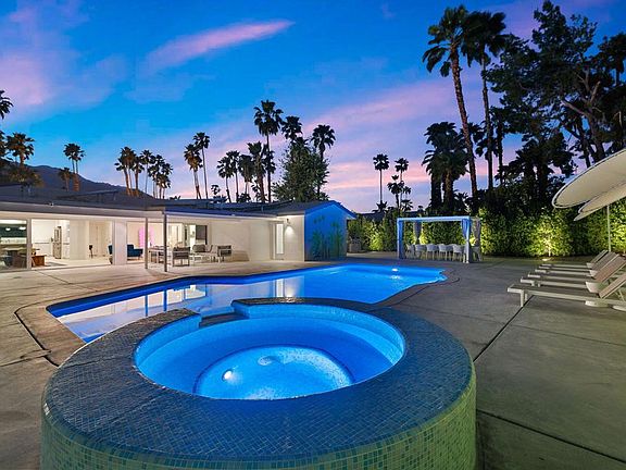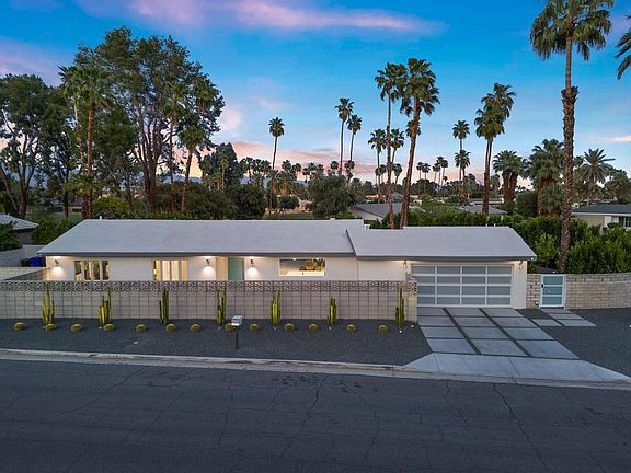 Mid-Century marvel, where luxury, sophistication, and vibrant energy come together. Recently re-imagined, this 4-bed, 3-bath treasure is set on an ultra-private 13,500 sqft corner lot in the sought-after Tahquitz Creek Golf neighborhood. Step inside to discover a perfect flow from the open-concept living area to the gourmet kitchen, featuring 24x24 terrazzo flooring, abundant lighting, and large sliders that open to the outdoor oasis with a sparkling pool. The kitchen is a chef's dream, boasting an 8-ft picture window framing spectacular mountain views, premium Kitchen Aid appliances, quartz countertops, a wine fridge, and a spacious island ideal for entertaining. The primary suite is a retreat of its own, offering a private patio, walk-in closet, and a spa-like bathroom with a glass-walled shower, freestanding tub, dual vanities, and direct access to the resort-style backyard. Outside, your desert sanctuary awaits, complete with a saltwater pool and spa, a tranquil freestanding dining area for al fresco entertainment, an eclipse stone fire pit, and a 5-hole putting green. On the south side of the property, a detached casita offers endless possibilities. Additional features include owned solar, a water purifying system, a newly installed foam roof, smooth coat stucco, low-maintenance desert landscaping, photocell lighting, and a complete studs-out remodel with upgraded electrical, ducting, and concrete work. Currently a VERY successful VACATION RENTAL!