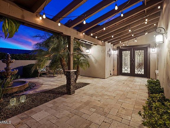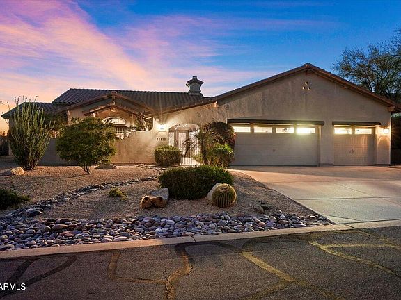 Lovely Santa Barbara style home on .5 acre+ private lot surrounded by desert wash and distant valley views - a rare gem in Pinnacle Peak Vistas! Sprawling 3,174sqft single-level home boasts 3 spacious bedrooms, 3 full baths, 3-car garage + dedicated office with private courtyard, dining room and flex space between guest bedrooms. Upon arrival, a charming front courtyard and tranquil fountain under a covered walkway welcome you and your loved ones into a home where the heart is! Step past the custom iron front door and you will instantly feel the timeless sophistication from a fully updated interior! Remodeled gourmet kitchen features gas cooking, custom cabinetry, ss appliances, quartzite countertops and custom backsplash...(continue) Updated flooring softly transitions between hardwood and natural stone. Every room calls your attention to stay just a little longer but the backyard steals the show! Imagine yourself dining outdoors under the covered patio, sipping cold drinks from the oversized pool & jetted jacuzzi, or sharing stories around the firepit with flames that dance under the desert moon. Experience the magical memories found only in Pinnacle Peak Vistas!