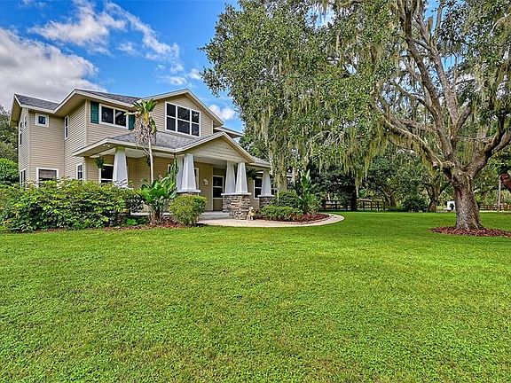PRICE REDUCTION! THE BEST VALUE ON ACREAGE IN THE LAKEWOOD RANCH AREA! Nestled at the end of a private and heavily wooded cul-de-sac, this gated estate offers unparalleled tranquility and privacy. A winding driveway crosses a gently flowing creek, leading to a custom Mark Cahill-built Craftsman home that blends timeless charm with modern luxury. Spanning 4610' u/air (6,699' total), and meticulously renovated in 2025, this 4/5-bed, 5-bath estate is ideal for equestrian enthusiasts, families, or those seeking a grand retreat, minutes from Lakewood Ranch’s vibrant amenities. The main residence (3/4 beds, 4 baths, 4000’ u/air) captivates with huge windows framing stately oaks. On the 1st floor, new luxury vinyl plank (LVP) flooring and new light fixtures throughout the home create a modern, cohesive aesthetic. A recently completed gourmet kitchen features all-new elite white cabinetry, stainless steel appliances, stylish backsplash, and quartz countertops. A navy coffee bar with storage and two pantries—one with a chic barn door—add flair. Not to be missed: a huge, concrete patio off the kitchen, ideal for al fresco dining. A brick double-sided wood-burning fireplace connects the kitchen/morning room and expansive family room, creating a cozy centerpiece. Entertain in the formal dining room, open-concept parlor, or bright morning room. An office with barn door and a spacious mud room enhance functionality. An ensuite bonus room with a renovated bathroom features a private entrance making it the perfect spot for a movie or game room. Upstairs, there are 4 bedrooms, all ensuite. The Primary Suite features a brand-new opulent spa-inspired bathroom with a striking oversized square soaking tub, an expansive shower with a luxurious rain shower head, sleek new cabinetry, and premium flooring. Large windows overlook the back pastures, complementing a spacious bedroom with new carpet and walk-in closet. The 2nd Primary bedroom boasts a brand-new renovated bathroom, paired with a super-sized bedroom featuring new carpet, a spacious walk-in closet, and large windows overlooking the front yard. Bedrooms 3 and 4 each have a walk-in closet and share a brand-new spacious Jack-and-Jill bathroom with dual sinks and a shower-tub combo. A large upstairs laundry room with ample cabinets and a sink ensures convenience. Connected by an 821’ covered parking area, the recently renovated guest house (1 bed, 1 bath) exudes charm with a front porch and large enclosed lanai. Elegant wood-look tile flows throughout, enhancing a modern kitchen with grey cabinets, stainless steel appliances, a dining room, and a family room. The luxurious bathroom features a walk-in shower, complemented by a bedroom with a walk-in closet and a laundry room with cabinets and stackable washer/dryer, ideal for guests/income potential. The barn offers 5 stalls, a feed and tack room, and a concrete center aisle, each stall opening to a paddock. The entire estate is fenced and cross fenced with 5 separate pasture areas. No HOA and non-flood zone status (Zone X) offer freedom and security. Just minutes from Lakewood Ranch, Florida’s premier master-planned community, enjoy miles of trails for biking and hiking, clubhouses with pools and fitness centers, pickle ball, tennis, and golf. The 75-acre Premier Sports Campus hosts soccer/lacrosse, while the Sarasota Polo Club caters to equestrian enthusiasts. Shop and dine at Main Street, Waterside Place, or University Town Center’s 100+ stores.