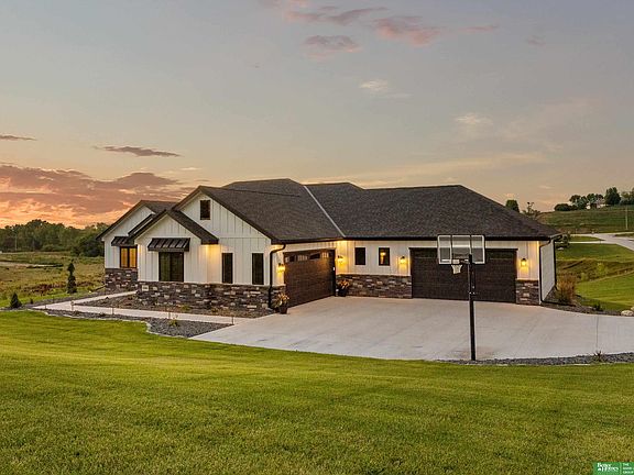 Introducing this stunning acreage in Gretna’s prestigious neighborhood, The Estates at Wynwood! Less than two years old, this custom-built walkout ranch offers modern sophistication and excellent craftsmanship. Nestled on 1.75 acres, the home showcases a 5 bed / 3 bath open floor plan. The gourmet kitchen boasts high-end appliances and a massive walk-in pantry. Enjoy the warmth of stone fireplaces on both levels. The primary suite offers a private office and a lavish en-suite. The walk-in closet connects to the main floor laundry and a drop zone off the oversized 4-car garage. The finished lower-level impresses with a wide-open rec room, full bar, and a home gym. You’ll find two more large bedrooms, a stunning bathroom, and an abundance of storage throughout. Step outside to the sprawling limestone patio, featuring a fire pit, hot tub, and a dedicated play area. Take in breathtaking sunset views from the covered deck stretching for miles! Gretna Schools. City water, septic system.
