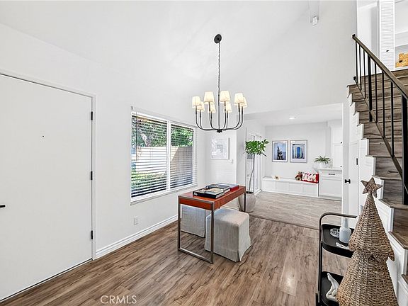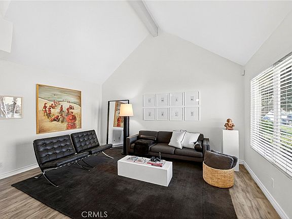 Discover contemporary living in this beautifully remodeled 3-bedroom, 2-bathroom condo, designed with a bright, open-concept flow that maximizes both space and natural light. The spacious main floor boasts high ceilings and features a seamless, stylish transition between the primary living/dining areas and the kitchen, unified by attractive wide-plank grey wood-look flooring. The kitchen effortlessly blends style and function, equipped with high-end features including crisp white cabinetry, sleek black fixtures, and KitchenAid stainless steel appliances. Features a spectacular custom-built-in white window bench adjacent to the kitchen, creating a cozy and flexible dining or reading area. The master is equally impressive with a generous walk-in closet and a luxurious bathroom featuring a dual-sink vanity. For added convenience, the home includes a separate laundry room and an attached two-car garage with direct access. Outside, the private, fenced patio is ideal for relaxation with its durable concrete slab floor and natural shade from mature trees overhead. Best of all, this home is conveniently located close to the freeway, placing you just minutes from local markets and favorite restaurants, offering the perfect blend of sophisticated interiors, comfort, and unparalleled practicality.