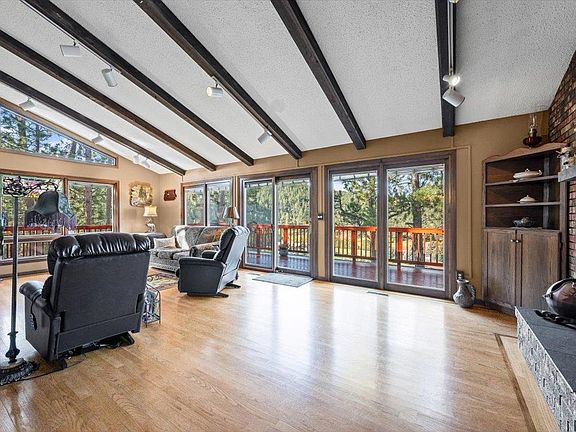 Perched above a striking rock face with the creek winding below and views of the beautiful Black Hills pines, this distinctive 1.5-story home offers unmatched privacy and tranquility. Set on 1.64 acres, the residence features 3 bedrooms, 2.5 bathrooms. The main level showcases a spacious living room with soaring vaulted beam ceilings, a striking brick accent wall, hardwood flooring, and a cozy gas fireplace insert. A sliding glass door opens to the redwood deck—recently stained—creating an inviting space for both relaxation and entertaining while taking in the natural surroundings. The kitchen is equipped with double ovens, a breakfast bar, and adjoining dining space. Upstairs, the primary suite includes a private bathroom, walk-in closet along with two additional bedrooms and a full bath. The newly added walk-out door on the lower level, opens to a second deck with the same amazing views as the upper deck and landscaped pathway. Inside, the generous family room easily accommodates a pool table, complete with a gas stove, and storage area. Recent upgrades include new roofs on both the home and detached 24x24 garage (with new concrete floor and added 110 & 120 electrical). A main-floor laundry was also added for convenience. Solid alder doors add warmth throughout the interior.