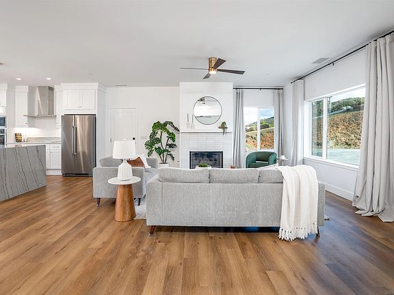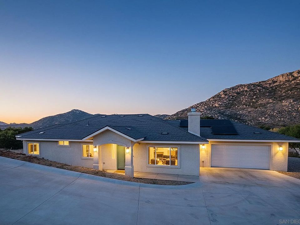Welcome to your custom-built sanctuary in the rolling foothills of Ramona. This modern residence, completed in 2022, sits on more than 2 acres of oak-studded land with a seasonal creek, offering sweeping mountain and valley views along with unforgettable sunset panoramas. Step inside to a bright, open layout framed by 9-foot ceilings and a warm, modern wood-burning fireplace already wired for propane—perfect for cozy evenings or entertaining. The heart of the home is a gourmet kitchen featuring quartzite countertops, a spacious center island, and a walk-in pantry, blending style with everyday functionality. The primary suite serves as a peaceful retreat, complete with private patio access so you can immerse yourself in the surrounding beauty any time of day. Outside, the property is designed to enhance your lifestyle, offering a concrete pad wired for a 240V jacuzzi and electrical run to the top of the driveway—ideal for future lighting, a gate, or other upgrades. Tech-ready and thoughtfully built, the home is wired throughout with Cat6 cabling routed to a central closet, making it simple to add a security system or expand your network. Additional features include durable luxury vinyl plank flooring, owned solar panels, and an insulated two-car garage with plenty of additional parking. With no HOA, public water, a septic system in place, and R-1 Single zoning, the property offers flexibility for equestrian uses, gardening, or future enhancements. This home beautifully combines modern comfort with rural serenity—move-in ready and designed for a lifestyle of relaxation.