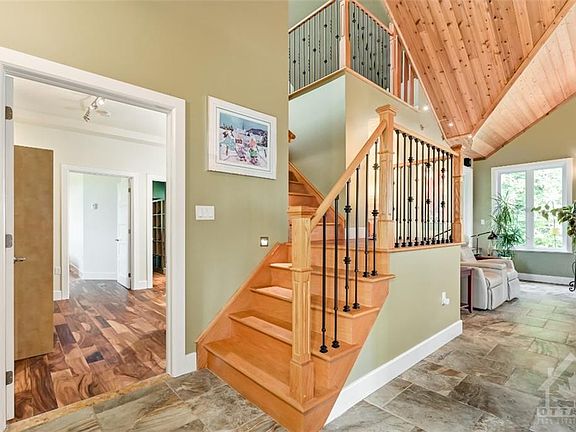 Gorgeous custom built open concept Bungalow w/ vaulted ceilings surrounded by over 5 acres of land. Upon arrival, you'll be greeted by a 200 ft driveway leading up to the house w/ a grand front porch. This dream home has a spacious 2 bed plus loft & 3 bath layout & includes a huge oversized dbl car heated garage. Impeccably maintained, the main lvl features a stunning gourmet chef's kitchen w/ high end appliances, porcelain/stainless steel sinks & Quartz countertops. Both bedrooms have their own ensuites with the Primary bedroom showcasing a spectacular oasis of an ensuite. A powder room, laundry unit, library/office, dining & living room that lead to the three season sunroom complete this lvl. The loft can be used an as additional bedroom, office or entertainment space. Beautiful hardwood, cork flooring and tile throughout with infloor radiant heat. Extremely well designed, this home offers plenty of space for your family to enjoy. 24 Hours Irrevocable on all offers as per form 244.