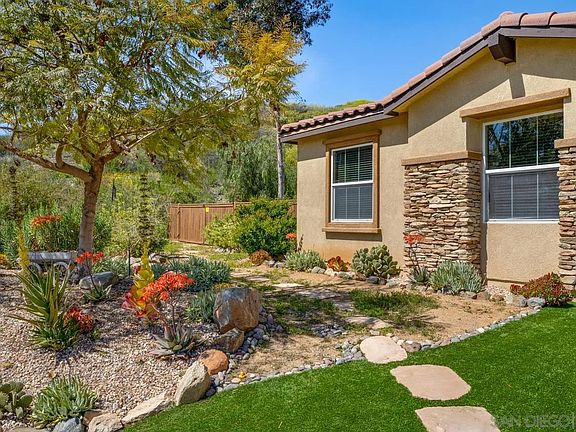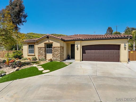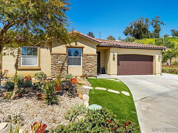 Nestled in the Morning View community of Santee, this stunning single level home boasts a variety of luxurious upgrades like Solar, pool, jacuzzi, cabana and thoughtful touches throughout. The home was the last one built in the community in 2012, ensuring modern design elements and plenty of space to stretch out and relax. Upon entering the home, the high ceilings and abundant natural light create a welcoming atmosphere that is perfect for entertaining or simply unwinding after a long day. The spacious living room features a stunning stone fireplace, built-in wood media cabinets, and a surround sound system, making it the perfect spot for family gatherings or movie nights. The kitchen is a chef's dream, with a large island, gorgeous granite countertops, and stainless steel appliances. The primary suite is a true oasis, with a large walk-in closet, ensuite bath, and a luxurious soaking tub and shower. Two additional large bedrooms and a guest bath provide plenty of space for family or guests. Step outside and enjoy the privacy of a cul-de-sac location with no homes behind, where you can relax on the covered veranda with your morning coffee, watching the kids play newly landscaped yard's play area adjacent to the newly installed sparkling pool and jacuzzi with an outdoor cabana provide a resort-style oasis right in your backyard. Don't miss your chance to own this exquisite property in the heart of San Diego.