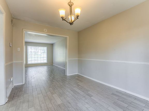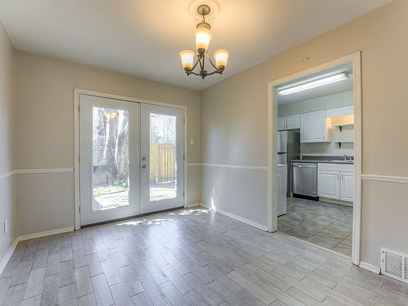 The kitchen is equipped with stainless steel appliances, granite-style countertops, and clean white cabinets. French doors off the dining room lead to a private outdoor space ideal for relaxing or hosting.