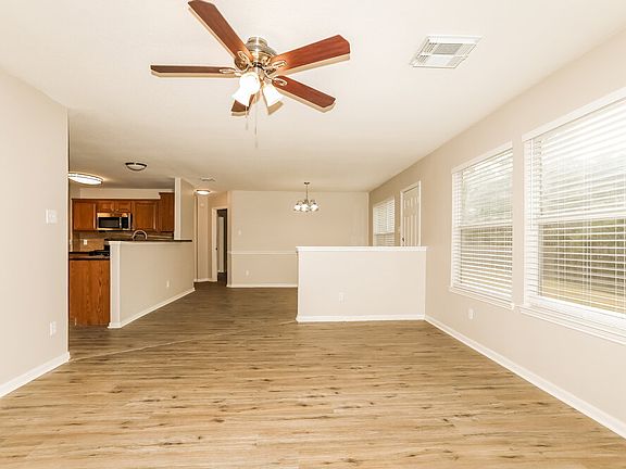 With 2,435 square feet of space and a fenced yard, this Conroe, Texas rental home offers ample room to spread out over five bedrooms and two bathrooms. Follow the entry foyer past the bonus space and into the family room. There, you'll find a corner fireplace with a tile surround and an abundance of natural light from a row of windows. Enjoy preparing meals using the stainless steel appliances in the well-appointed kitchen. There's a large pantry for extra storage and a built-in microwave. Towards the rear of the home, the primary suite offers privacy from the other bedrooms. Along with its elongated walk-in closet, the suite includes an impressive private bathroom. Call today to book your tour.