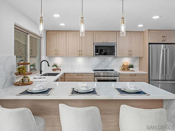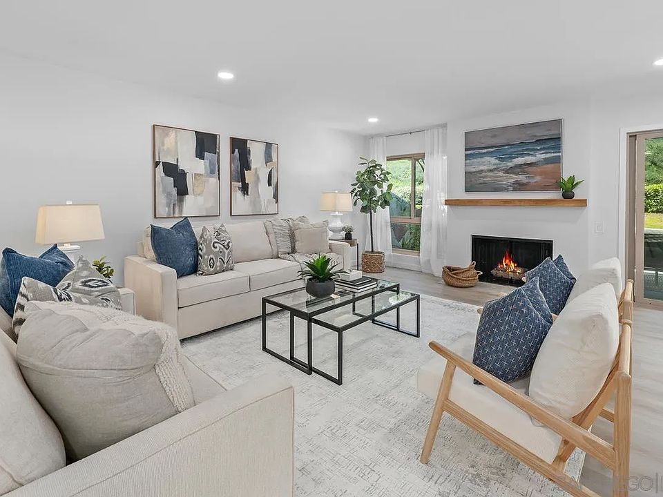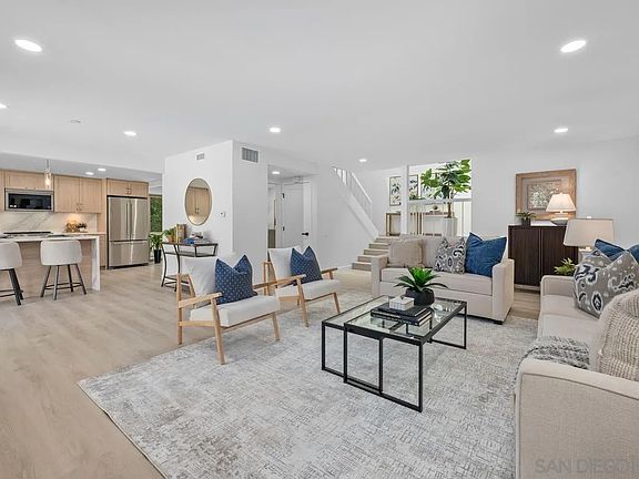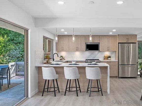 Stunningly remodeled 3BR/2.5BA 2,080 sq.ft. home tucked away at the end of a tranquil tree-lined cul-de-sac on the East Side of Mount La Jolla. This prime location has an expansive greenbelt at your backdoor— offering unmatched privacy and tranquility. The gorgeous remodeled open-concept kitchen features brand new appliances and quartz countertop with waterfall edge. Enjoy the large dining/family area and separate living room with fireplace. Beautiful luxury plank flooring throughout, fresh paint, and a bright interior orientation that floods the home with natural light. Generous primary suite with tastefully remodeled en-suite bath. Central A/C. Experience tranquility while enjoying two private greenscape outdoor patios plus balcony. The Mount La Jolla community is 63 acres and has resort-style amenities with four pools (heated year round), 4 USTA night-lighted tennis courts, Club house with large party facility with full kitchen and another meeting room with fireplace. Equipped gym with additional stretching room and steam saunas. Library with children's section. Putting green. It's like living in an urban forest with walking paths and amazing tree lined streets. Private roads, great for walks! This location is minutes to La Jolla Village, La Jolla Cove, Top-Rated Schools, restaurants, shopping, Pacific Beach, Mission Bay, beaches, Boardwalk and more. This home is Ideal for families, professionals, or downsizers looking for peaceful, amenity-rich living in a prime La Jolla location. ***Concierge HOA Services Include: Spectrum TV – Platinum Level with HBO, Showtime, Two DVR Boxes including the DVR Service Fee, High Speed Internet, Free Router and Wireless Modem. All Water Usage – Inside and Outside. All Exterior Maintenance Including Roofs and Painting. Termite. Sewer and Trash. Fire and Earthquake Insurance. Landscaping and Streets - Maintenance, Gardening, and Landscaping for 63 Acres. Onsite manager and maintenance staff.