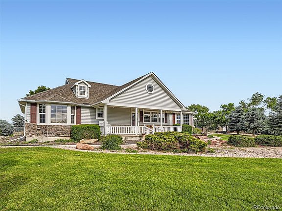 Beautifully remodeled ranch home in Watkins peaceful Prairie View community on a little over 2.3 acres of usable land! A west-facing front porch with unobstructed views provides a perfect spot to watch Colorado’s incredible sunsets, while the back patio enjoys peaceful sunrises. Beautiful professional landscaping and a classic front porch with included wagon wheel rocker offers a warm welcome home. Inside, be prepared to be wowed with this gem’s vast open layout enhanced with high-end finishes and quality workmanship throughout such as durable wide-planked laminate wood flooring, new door hardware, automatic window coverings, new Nest thermostats, a cozy wood stove, custom split wood holder, wood ceiling beams, sliding barn doors, beautiful paneled wall accents – and so much more! Home chefs will love the newly remodeled gourmet kitchen boasting a chef-worthy Wolf brand gas burner cooktop, high-end KitchenAid appliances, and gorgeous Shaker cabinetry. A front living room could also make a great formal dining room. Incredible primary retreat with west-facing bay window to let in all the natural sunshine, 5-piece en-suite bath, and a dreamy walk-in closet. A recently converted attic adds extra living space and a private get-away from the main level. Enjoy the peaceful backyard sanctuary with a large flagstone patio perfect for entertaining, 2 storage sheds for all your tools and gear, and a lush yard! RV folks will relish the RV parking in the back with sewer, water, power connections for easy storage, and tons of concrete to store many toys or vehicles. New AC unit ready to be installed! Access to the main road is from the rear of the property giving the front of the home lots of privacy, and a south-facing driveway means quick winter snowmelt! Superb location only 10 minutes to Bennett, 15 minutes to DIA and 30 minutes to downtown Denver. This beautiful home is a must-see and ready for you to call it yours!