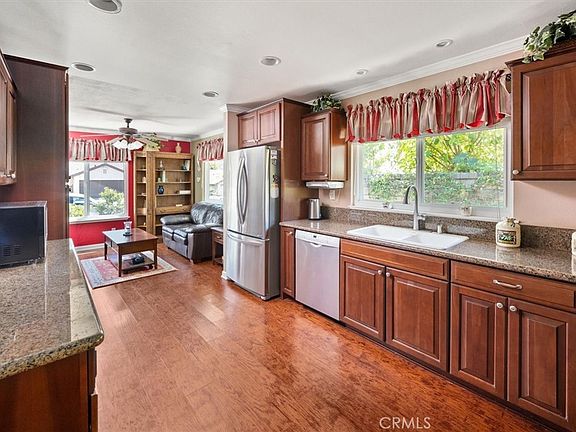 The serene and private backyard features a large covered patio that overlooks lush trees and greenery. The expansive side walkways and full sprinkler system provide added convenience. The spacious primary bedroom is highlighted by a beautiful 8 ft wide window that captures the tranquil view of the backyard retreat. The primary bathroom is tastefully designed with stylized crown moulding, double sinks and contemporary tile work, including a full shower. The bedroom also features mirrored closet doors.