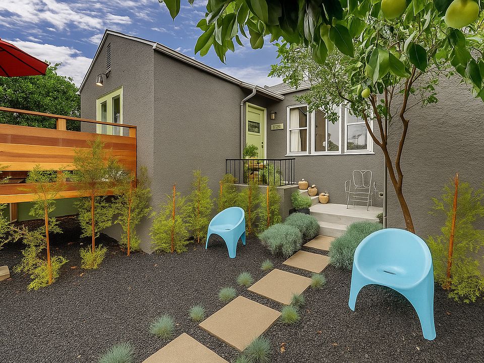 Three bedroom, two bath home with a kitchen and breakfast area and stainless appliances, new baths, master suite, tankless water heater, deck, living room with faux fireplace, formal dining room, hardwood floors, copper plumbing, one car detached garage, and a convenient location in Glassell Park