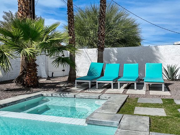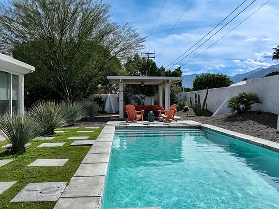 It's that magical time again in Palm Springs, when the air is crisp, the mountains glow, and the pool parties practically plan themselves. Step into your new desert retreat, a solar-powered stunner with everything you need to live, lounge, and entertain in full sun-soaked style. Inside, the open-concept living and dining area brings serious retro vibes with a painted brick wall, Sputnik chandelier, and sleek track lighting. The galley kitchen shines with dark stone counters, skylights, and stainless-steel appliances because even martinis deserve a stylish prep space. But let's be real, the showstopper is the primary suite complete with a huge deluxe shower fit for one, two, or, you know... the whole team. (Hey, what happens in Palm Springs, stays in Palm Springs.) A skylight, soaking tub, and extra-large waterfall showerhead make it the kind of ensuite you'll never want to leave. Out back, your private west-facing paradise awaits, featuring panoramic mountain views, a saltwater pool and spa, a custom pergola, a bocce ball court, and a fire pit. Plus, this home sits on fee land (you own it!) with no HOA, and the area has just reopened for new short-term rental applications a rare opportunity for investors and lifestyle dreamers alike. Fully furnished and accessorized, it's move-in ready. Just bring your script, your sunglasses, and your best stories.