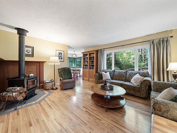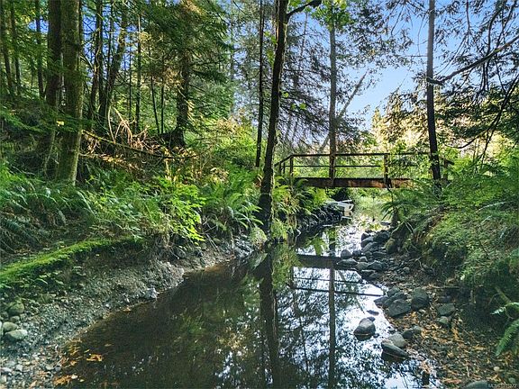 Open House Sat 11-1. An exceptional 5-acre forest retreat offering privacy, character, lifestyle! Enchanting trails wind through ferns, cedars, firs, revealing sunlit clearings, lush garden pathways, magical corners of the woods. One trail leads to a dock on the pond — the perfect place to pause and reflect. Another meanders to fenced gardens, others invite quiet discovery. Whimsical playhouse adds delight, seasonal stream enhances the setting. Anchoring it all is gorgeous mid-1950s Craftsman-inspired rancher with 2 bedrooms & 1 bath, relocated in 1995 to new foundation. Inside, hand-painted floors, artisan details, and wood-burning fireplace create warmth and artistry. Second bedroom includes custom Murphy bed for flexible use. Beautifully crafted stone patio extends living outdoors, perfect for gatherings or solitude. 625 sq ft heated workshop and double carport add versatile space. Minutes from Sooke’s amenities yet worlds away, this rare acreage offers beauty, privacy, possibility.
